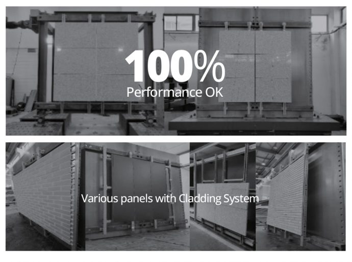 - The cladding system underwent performance tests with different panels, and all tests confirmed its excellent seismic performance.