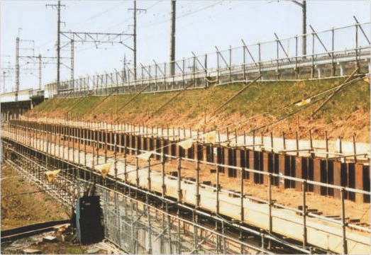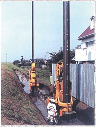 - Steel sheet piles are installed by driving them deep into non-liquefying soil layer at locations near the foot of the slope of embankment on liquefying soil foundation.