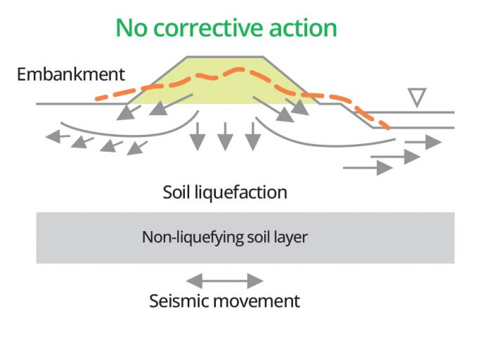 - Embankment structures slip and collapse, sink, crack or change in other ways if the foundation liquefies.