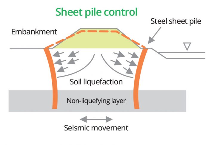 - Driving high-quality steel sheet piles at the foot of embankment declining in foundation rigidity control the deformation of liquefying soil foundation and collapse of embankment structures.