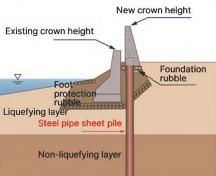 Method of controlling lateral flow of the ground by means of seismic retrofit applying steel material either at hinterland or in front of revetment.