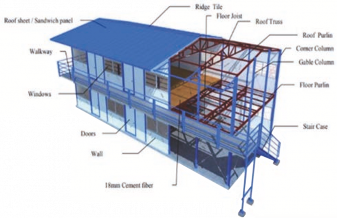 Rapid House is a faster and economical construction solution, the skeleton is made of hot rolled tubular structures made by ‘Tata Structura’ and cladded with sandwich panels made of PUF/mineral wool with PPGL sheets. These are lightweight with good thermal and acoustic efficiency, prefabricated in factory to get good Quality. Less on-site labor and construction time which can be used as a quick restoration solution. It can be built in the range with G, G+1, G+2 floors for disaster relief camps, labor accommodation, canteen, and toilets.