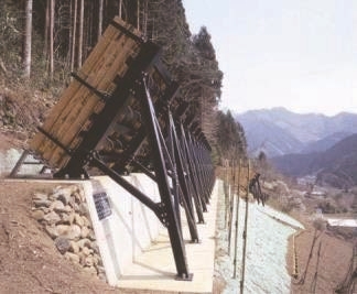 The prevention wall disperses the force of stones falling down on the slope with use of cushion material (sand, tire, timber, etc.) to reduce force and capture them. - Falling-stone prevention net