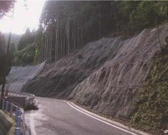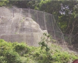 Stripped slope surface and boulders on mountain slopes with danger of falling debris are covered with metal net and wire rope to prevent disasters. Its flexible structure is used to control falling rocks safely down the slope. - Pocket-type falling-stone protection net