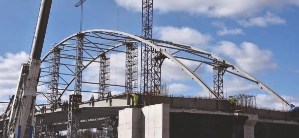 MS-15 viaduct over river Lyna in Olsztyn, Poland, opened in traffic in 2017. Two separate net arch structures, each one with a span of 120m. The arches have a height of 21m, an axis – distance of 13.4m and are realised with hot-rolled profiles HD 400 x 744 and HD 400 x 1086 in HISTARØ 460.