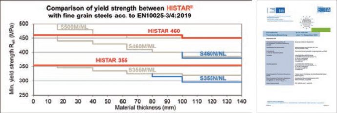 - Modern high strength steel grade HISTAR® 460 offers an excellent weldability, high toughness and high minimum yield strength compared to standard steel grades and has an European Technical Assessment (ETA).
