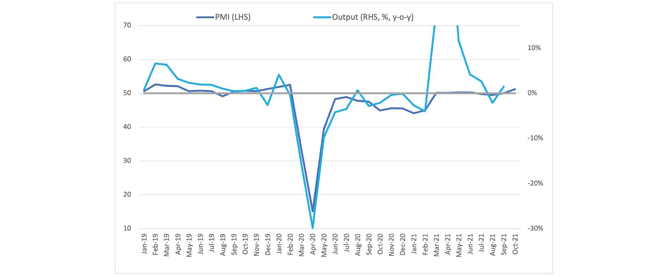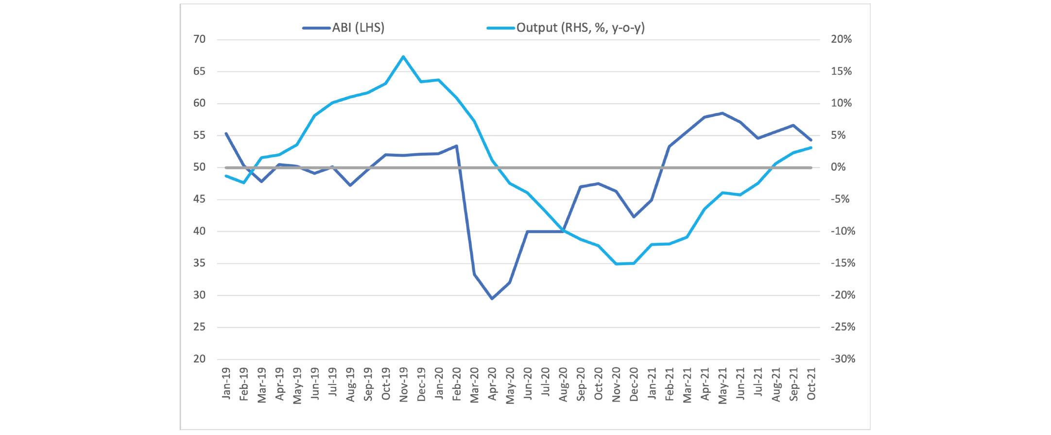 US | Private residential output constrained by shortages of materials; Private non-residential output growing.