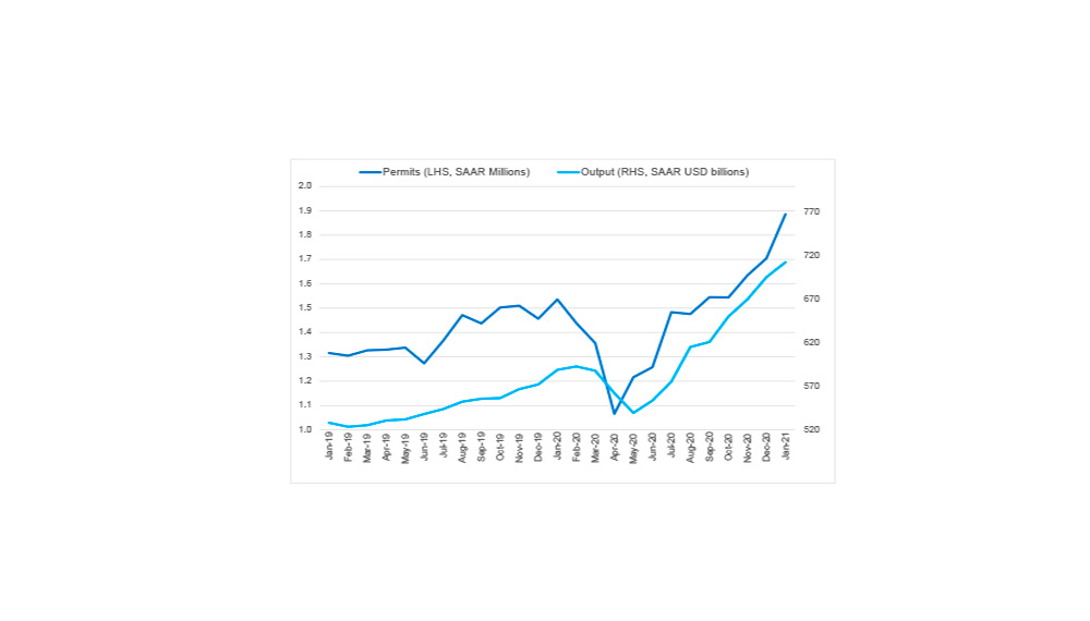 US | Private residential construction output up 21% y-o-y increase in January with housing permits increasing at a similar rate.